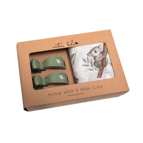 Add a touch of Australian charm to your baby essentials with the Koala Muslin Wrap & Sage Pram Clip Set by Emotion & Kids. Designed for everyday comfort and convenience, this adorable set features a sweet koala print muslin wrap paired with stylish sage pram clips.