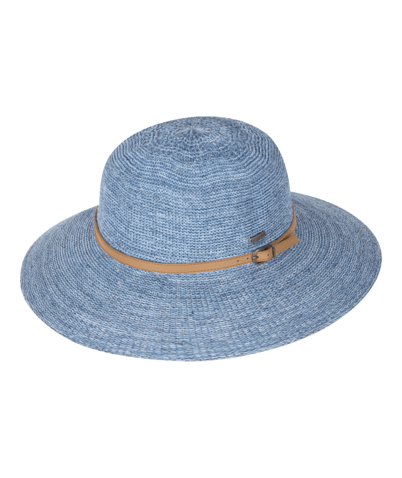 Made from durable polyester knit, the Leslie hat is packable and crushable, making it perfect for travel, beach days, and everyday wear. The soft powder blue shade adds a modern, summery feel, while the faux leather band with buckle provides a refined finishing touch. A fully lined crown and adjustable internal size ensure a secure and comfortable fit.