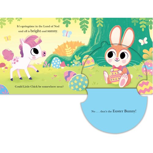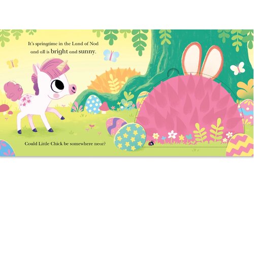 Spring has arrived in the Land of Nod, but Little Chick is missing! Join the adventure through a magical fairytale forest as you lift the flaps to search for Chick. Along the way, children will meet charming characters like Twinkle the unicorn, Poppy the fairy, and Rumble the dinosaur—and maybe even spot the Easter Bunny!