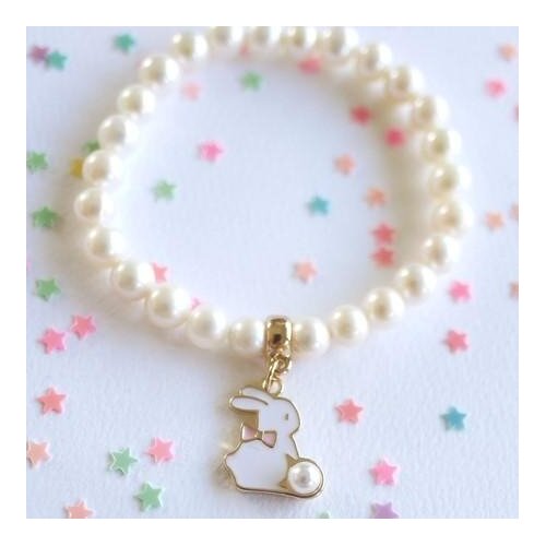 Look closely, can you see him? There! The little white bunny with the darling pink bow, and he has collected so many beautiful pearls. But he gathered so much that he cannot keep them all and has put them together in a gorgeous pearl bracelet for someone special to wear. Can you look after them for him while he finds more?