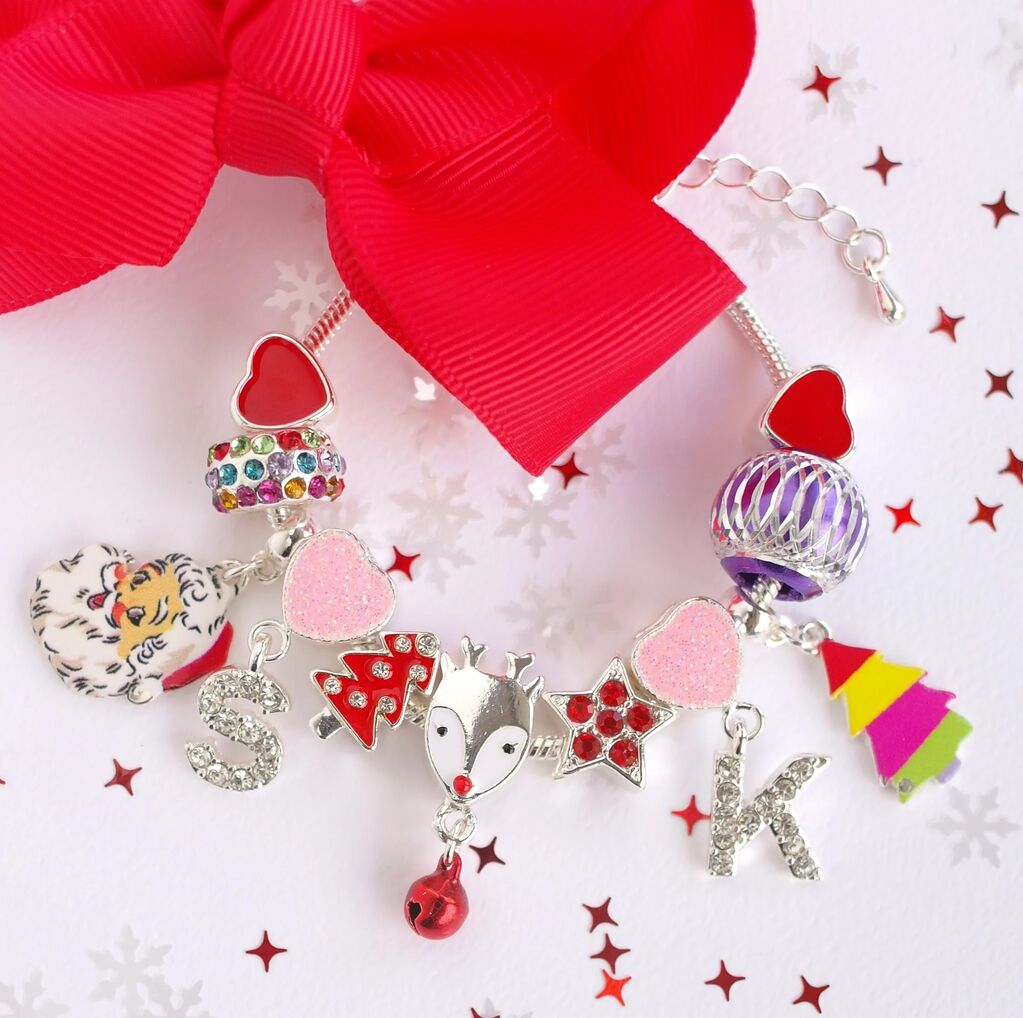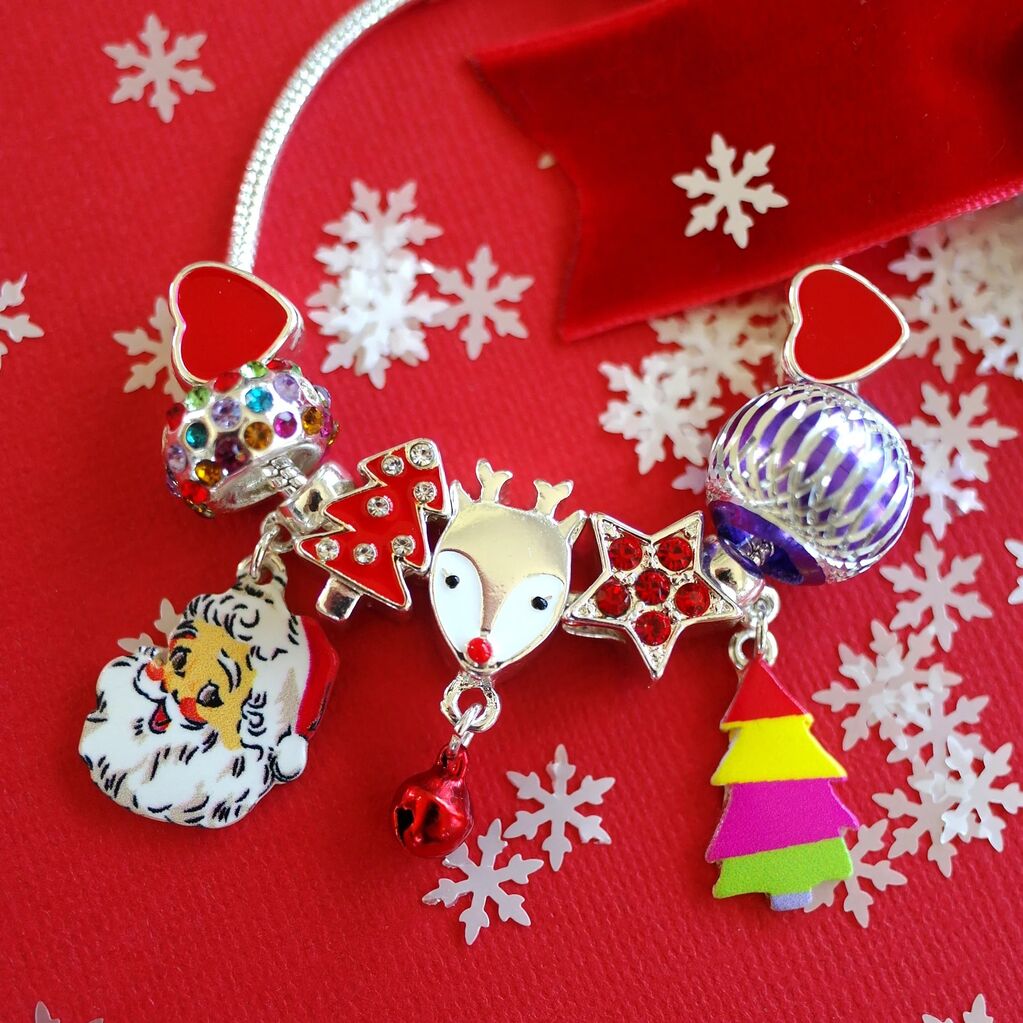 Add a sprinkle of festive magic with the Merry Little Christmas Charm Bracelet from Lauren Hinkley. This charming bracelet features tiny Christmas trees, jewelled baubles, and two adorable reindeer and Santa charms — a joyful reminder of the season. Crafted from high-quality silver-plated brass with an extendable chain, it fits kids aged 3 and up. Safe, stylish, and full of holiday cheer, it makes a perfect gift, stocking stuffer, or festive accessory to wear all season long.