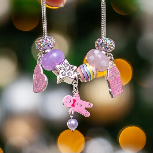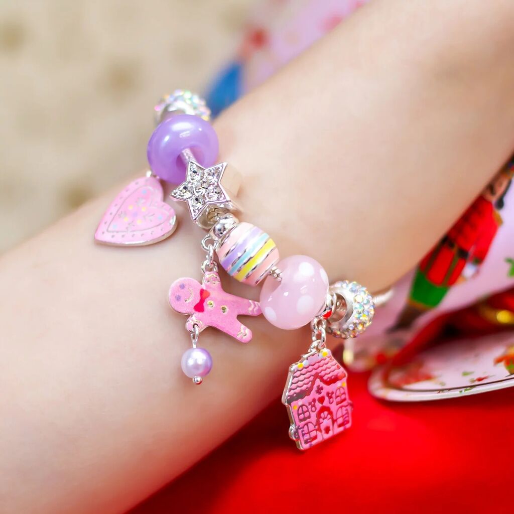 Featuring an adorable gingerbread person, a whimsical gingerbread house, and a soft pink heart charm decorated with pastel dots, this bracelet sparkles beautifully alongside coordinating festive charms. Thoughtfully designed in gentle pastel tones, it’s a joyful accessory that captures the warmth and sweetness of the holiday season.