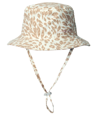 Cute leopard pattern girls bucket. Reversible with plain brown on the inside. 50+ UPF sun protection, made from quick dry fabric so can be used as a swim hat. Detachable chin strap.
