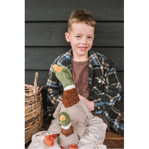 Hugo is the dashing duck who calls the Nana Huchy farm home. From the moment he hatched, he was a natural in the water-gliding gracefully across the pond with effortless charm. As dusk falls, Hugo snacks on his favorite treat: crunchy little insects that are oh-so-easy to catch in the golden light. When he's not swimming or snacking, he loves waddling around the farm like he owns the place, proudly showing off his glossy green feathers. Calm, confident, and full of character, Hugo brings a splash of charm and cheeky swagger to life on the farm.