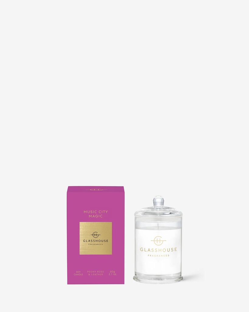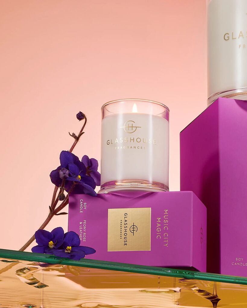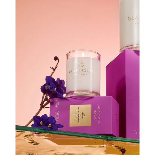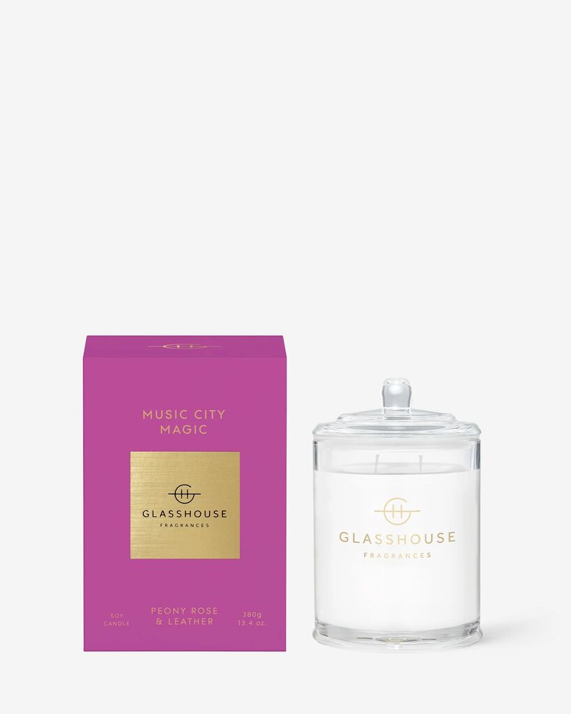 Turn up the charm with the Glasshouse Music City Magic Peony Rose & Leather 60g Candle, a bold and sophisticated fragrance inspired by warm southern nights.