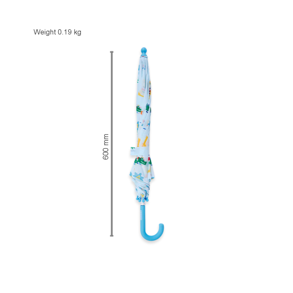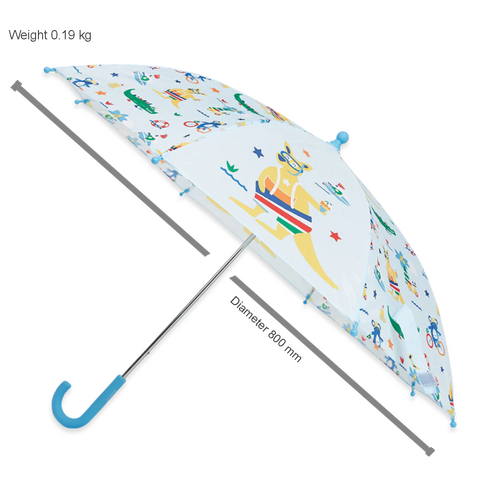 Rain, rain, go away, come again another day! Made with lightweight fibreglass spokes, a soft grip rubber handle, and a safety opening system to avoid pinching little fingers, our colourful Kanga Crew kids’ umbrella is the best accessory for cloudy weather. Make sure you pick up a matching Raincoat and Gumboots!