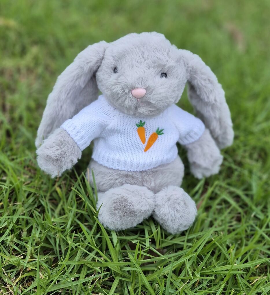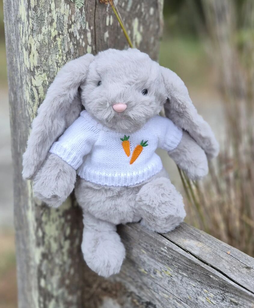 This adorable bunny comes with a removable white knitted jumper featuring an embroidered carrot design, adding charm and personality to every cuddle. Safe and suitable for newborns and up (0+ years), Ziggy makes an ideal gift for babies, toddlers, or as a keepsake.