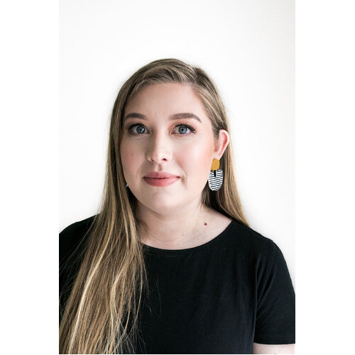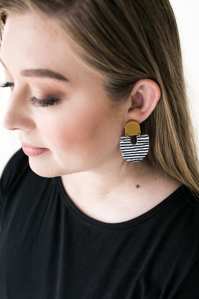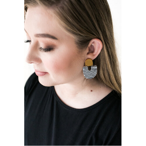 The ‘Moops’ Mustard / Stripe Dangle Earrings by Pink Nade pair playful pattern with a modern silhouette. Featuring matte mustard and white etched acrylic, these earrings make a confident style statement while remaining incredibly lightweight and comfortable to wear.