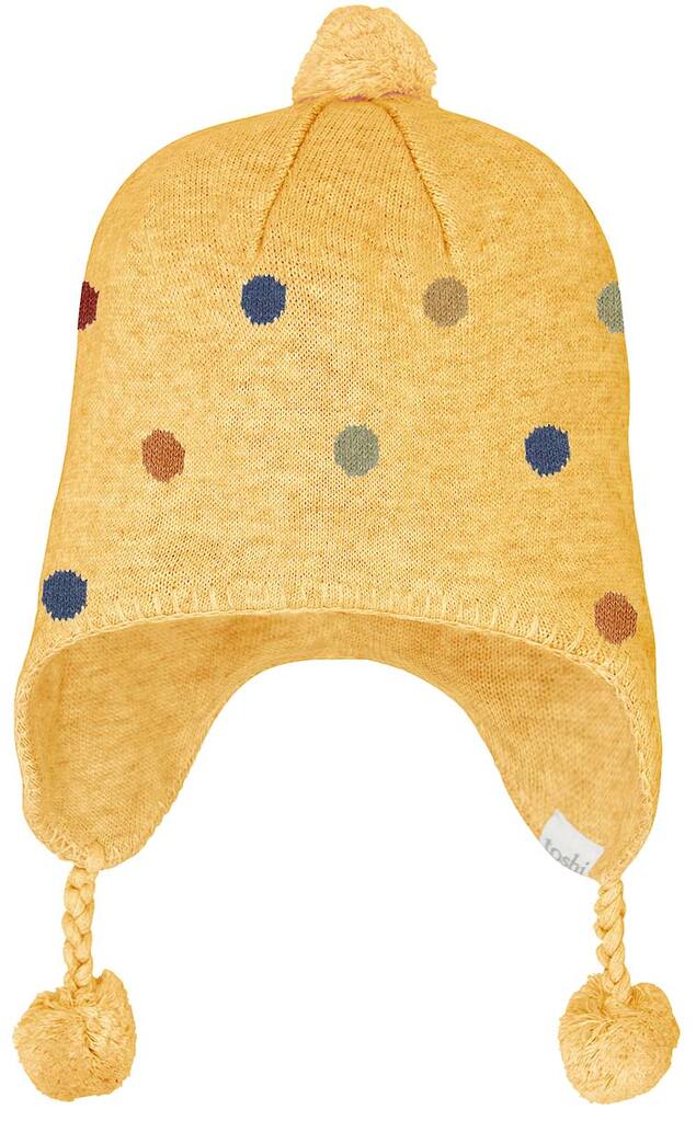 Toshi Earmuff Storytime Burtie is crafted from the finest quality certified 100% organic cotton yarn. Organic certification ensures the beanie is gentle on heads, as well as our precious environment. The beautifully textured melange yarn brings an element of refinement to the beanie. This beanie features ear flaps for cosy and nurturing protection from the elements. A vivid polka dot jacquard design creates a fun and whimsical style. Pom poms introduce a cute and playful look. The baby beanie Earmuff Storytime Burtie is fully lined for enhanced comfort and greater warmth during our cooler months.