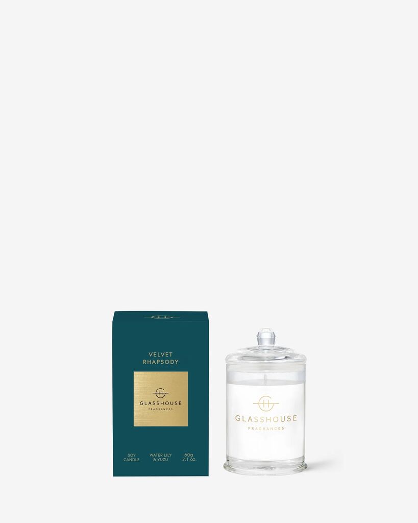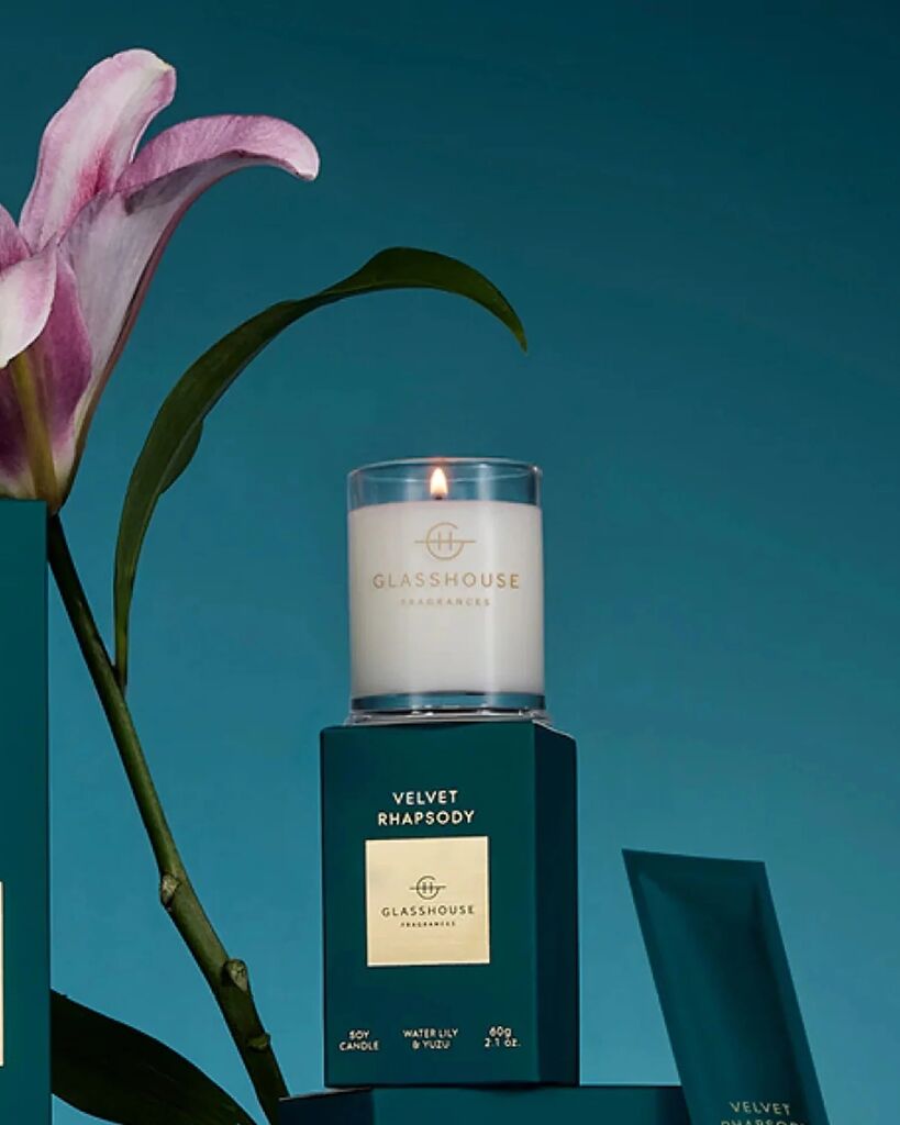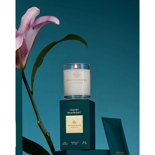 Indulge in the enchanting scent of the GLASSHOUSE Velvet Rhapsody Water Lily & Yuzu 60g Scented Candle, a beautifully crafted fragrance that captures the essence of a secret garden after rainfall. Light and refreshing, this candle blends aquatic florals with vibrant citrus notes, creating a serene and uplifting atmosphere.